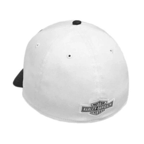 Harley-Davidson® Men's Embroidered Eagle 39THIRTY® Cap, 99427-18VM. Made from 97% cotton, 3% spandex. Official 39THIRTY silhouette by New Era. Contrasting bill with contrasting underside. Embroidered graphics on front and woven patch on back. Embroidered New Era flag logo on side. Stretch fit. The Embroidered Eagle 39THIRTY Cap features awesome needlework of our iconic eagle. High contrast black-and-white design. 99427-18VM