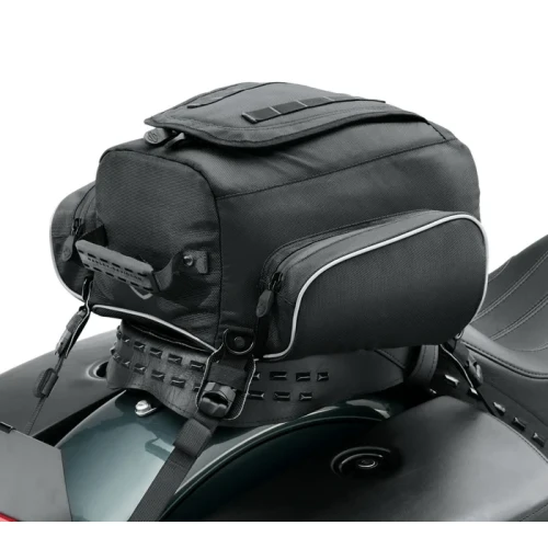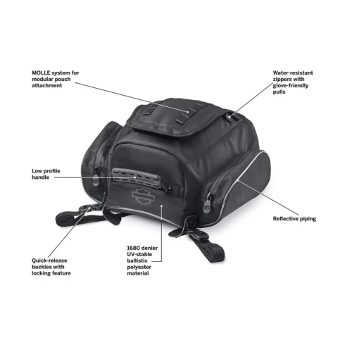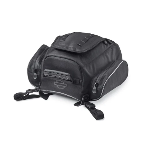 Designed by riders for riders, the Onyx Premium Luggage Collection is the best luggage Harley-Davidson has to offer and, provides everything you need in motorcycle luggage and nothing you don't. Great for daily commutes or for extra storage anytime, this Tail Bag provides the space you need. The main compartment is large enough to store a half helmet, rain gear or extra layers, while zipped side pockets are large enough to hold gloves or small electronic devices. The Tail Bag mounts to a passenger pillion and has locking, quick-release clasps for easy on and off the bike. The sturdy top handle and detachable shoulder strap make it easy to carry the bag to and from your motorcycle.