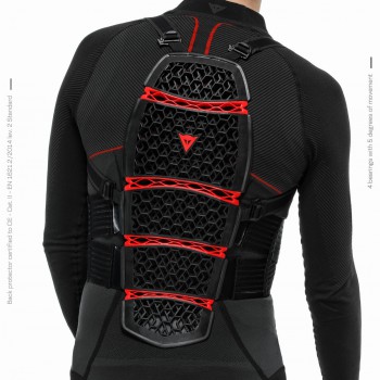 Ryggskinne, enten separat eller innebygget i jakke, beskyttelse på albue, skulder, bryst, hofte og kne.