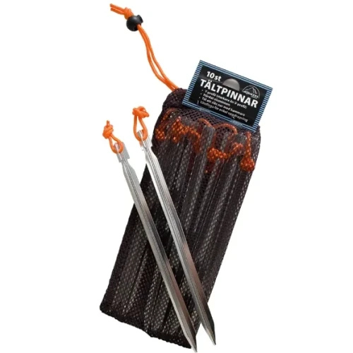 Teltplugger som kan slås ned i bakken med hammer og dras opp igjen med snøret som sitter fast i toppen på teltpluggene.