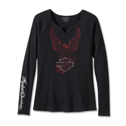 Flattering details merges with throwback style on our Limited Edition Flying Eagle Long Sleeve Thermal Knit Top. Its midweight cotton/polyester thermal blend delivers longwearing comfort in a textured look (zoom in to see). What sets this long sleeve women’s top apart from traditional silhouettes are its raglan sleeves, notched neckline, and distinctive vintage-style graphics—and eagle + rose-inspired design fills the front while our seasonal script rides up the sleeve. Lock into this timeless look now since supplies are limited.