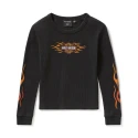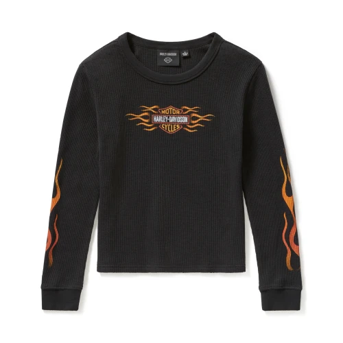 Add a layer of fiery H-D style with our Vintage Flames Knit Top. It’s made from a thermal cotton/polyester blend that’s enzyme and softener washed for worn-in look and feel. This women’s long sleeve crew neck is finished with gradient flame graphics on front and searing up the sleeves.• Materials: 60% cotton, 40% polyester midweight thermal, enzyme and softener washed.